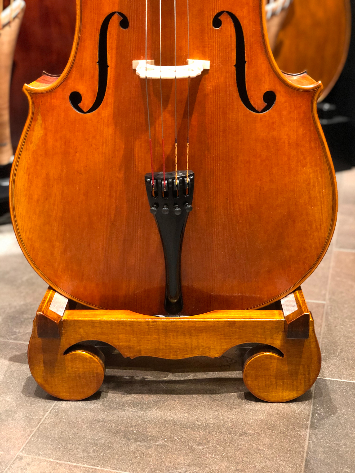 Stabiler und ansprechender Cello-Holzständer aus lackiertem Ahorn Massivholz – handgefertigt in einer Geigenbauwerkstatt in Siebenbürgen (RO). Geeignet für 4/4, 7/8, 3/4, 1/2 und 1/4 Cello-Größen.